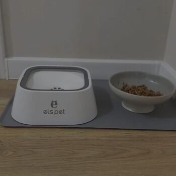 It works really well at keeping the mess off the floor from our dog, and our cat can drink out of it too!