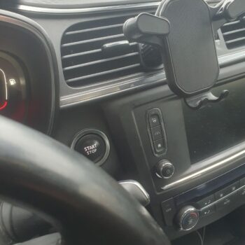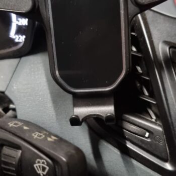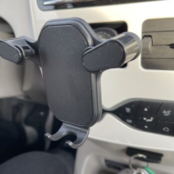 Mounts firmly to the air vent and operates smoothly. Easy to place and remove the phone, and there’s space for a charging cable.