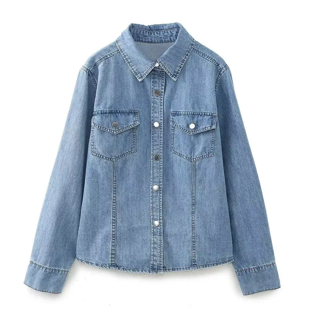 What sets this blouse apart is its unique combination of design elements. It’s more than just a denim shirt; it’s a fashion statement that speaks to the elegance of simplicity. The attention to detail with patch pockets adds a utilitarian charm, while the pristine cut reflects sophistication. It’s not just clothing; it’s a confidence booster for the middle-aged woman who appreciates style without compromising on comfort.