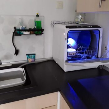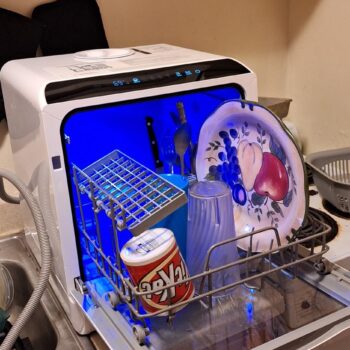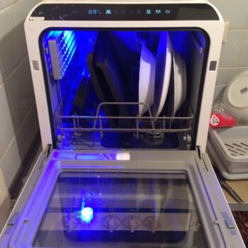 This adorable dishwasher has been a smart, cost-effective solution for our small kitchen. Love that you can either fill it manually or hook it up to the faucet, and using a bucket for draining works well. It saves water and energy, plus it looks cool with its blue light.