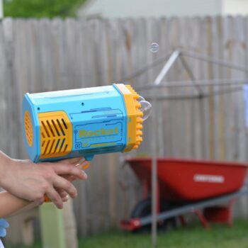 Love how it creates a ton of bubbles and is durable for long play sessions. The downside is that it doesn't hold the bubble liquid inside. You have to dip it in a larger bowl, then press the button. It creates a cluster of small bubbles.