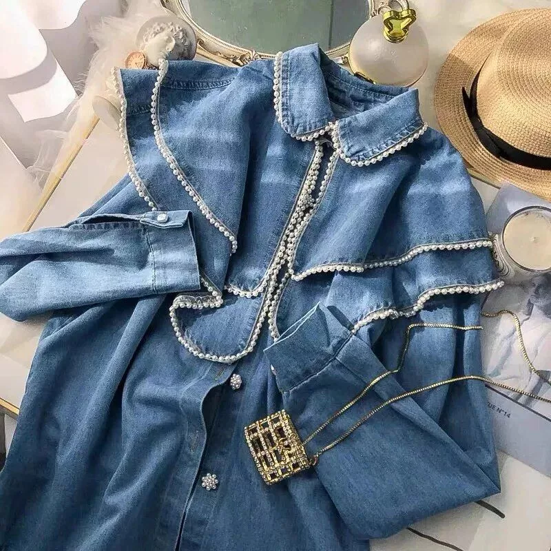 Elevate your spring wardrobe with our enchanting French Style Doll Collar Denim Blouses. These vintage-inspired blouses are designed to capture the essence of timeless fashion while offering the utmost comfort and style. With their unique pearl design and classic denim fabric, these blouses are a must-have addition to your collection.