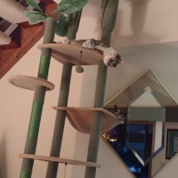 As someone who tends to approach purchases with a healthy dose of skepticism, I must admit that I embarked on acquiring this cat tree with a fair amount of trepidation. However, to my sheer delight, my expectations were not only met but exceeded. From the moment it was assembled, it exuded a sense of sturdiness and durability that immediately put my mind at ease. But the true testament to its quality lies in the unfettered joy it brings to my two lively kittens, Piper and his spirited sister. At 6 and 8 months respectively, they possess an abundance of energy and a penchant for exploration. This cat tree has become the epicenter of their adventures. Piper, in particular, has taken a particular shine to the hammock, where he can be found lounging in regal splendor for hours on end. It's his personal sanctuary, a haven where he can survey his domain with an air of contentment that warms my heart. But don't be fooled by his serene demeanor; when the mood strikes, he transforms into a whirlwind of activity, zipping around the tree with his sister in tow. Speaking of his sister, she's equally enamored with their new plaything. Together, they've transformed the cat tree into a veritable playground, a space where they can indulge in all manner of feline antics. From impromptu wrestling matches to daring leaps and bounds, their boundless enthusiasm knows no bounds. And through it all, this sturdy cat tree has stood firm, weathering their exuberant escapades with grace and resilience. Not a creak, not a wobble – it remains steadfast in the face of their boisterous exploits. As for me, I couldn't be happier with my purchase. It's brought immeasurable joy to my kittens' lives and peace of mind to mine. Here's to many more years of laughter, mischief, and endless adventures with Piper, his sister, and their beloved cat tree.