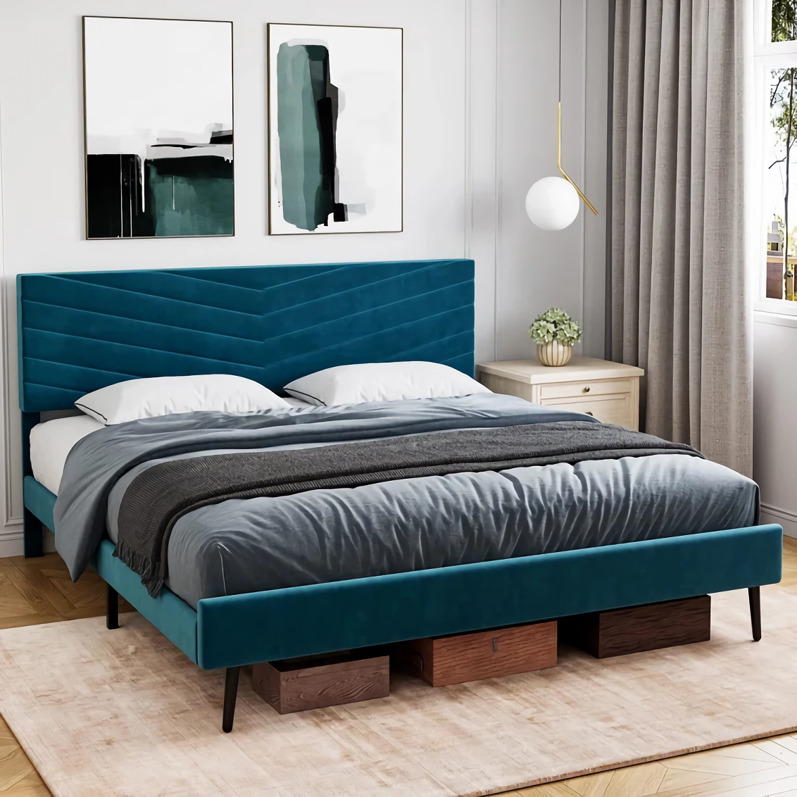 Experience the ultimate in customization and comfort with our adjustable headboard. Offering three height settings, it caters to your unique comfort needs, whether you enjoy reading in bed or watching TV. The plush upholstered headboard, measuring 76.4″L x 81.9″W x 42.5″H, is not just a statement of style but also a promise of comfort. Our bed frame’s sleek, modern design, accentuated by its stunning blue color and wood finish, effortlessly complements any bedroom decor. Its appearance embodies modern style, Scandinavian simplicity, and a hint of modern Morocco, making it a versatile addition to any interior design theme.