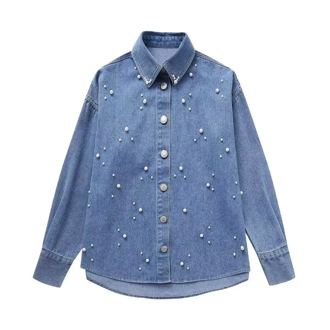 Step into a world where casual meets chic with our latest arrival for the modern woman. The Ladies’ Pearl Beaded Denim Blouse is a breath of fresh air in the Spring/Summer collection, offering a blend of sophistication and laid-back style. Designed to cater to the fashion-forward office lady, this top exudes a subtle opulence with its delicate pearl beading and appliques. Whether you’re powering through office hours or stepping out for a casual brunch, this blouse is your perfect companion.