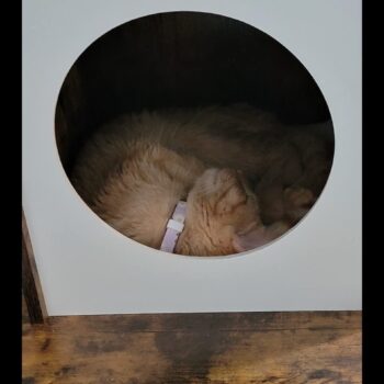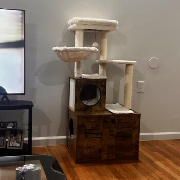 • Features a large, spacious cabinet that can double as a cozy sleeping area or house a litter box.