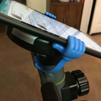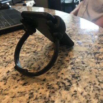 I purchased this gadget to hold my phone in my craft room and office. It securely held my phone but allowed me to slide my hand down without interfering with the volume control. The hands can be rotated, and I think it would make a great stocking stuffer.
