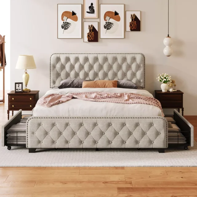 What truly sets our bed frame apart is its multifunctional beauty. The frame’s solid construction guarantees longevity, while its sleek design brings a sense of luxury to your sleeping space. The absence of customizability ensures you receive a meticulously crafted, reliable product. With its integrated storage space, it’s not just a bed—it’s a solution to your bedroom storage needs, making it a practical choice for modern living.
